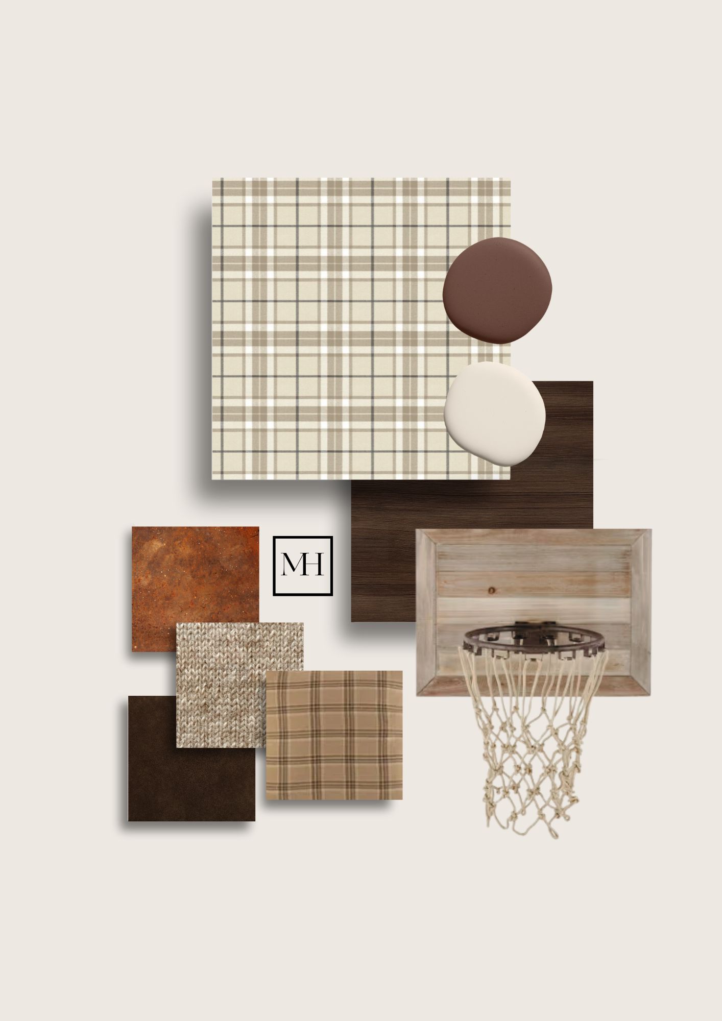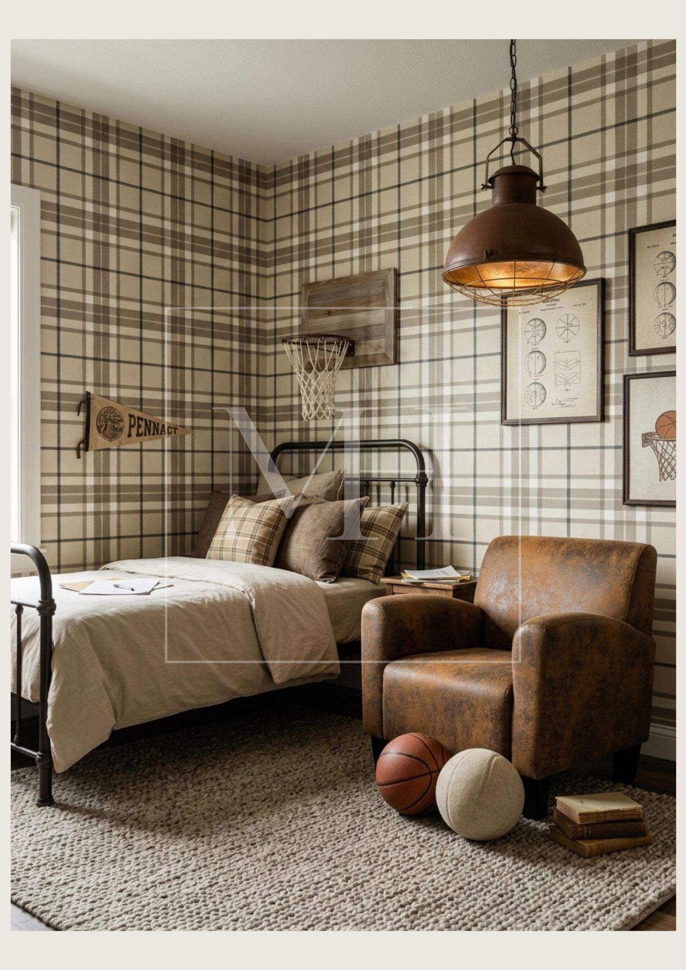 Découvrez une chambre d’ado où caractère et sophistication se rencontrent. Le papier peint à carreaux beige et brun apporte structure et graphisme, tandis que le fauteuil club en cuir camel vieilli et les touches vintage confèrent chaleur et authenticité. Le panier de basket en bois et cuivre devient un détail à la fois fonctionnel et décoratif, rappelant subtilement la passion de l’ado pour le sport.