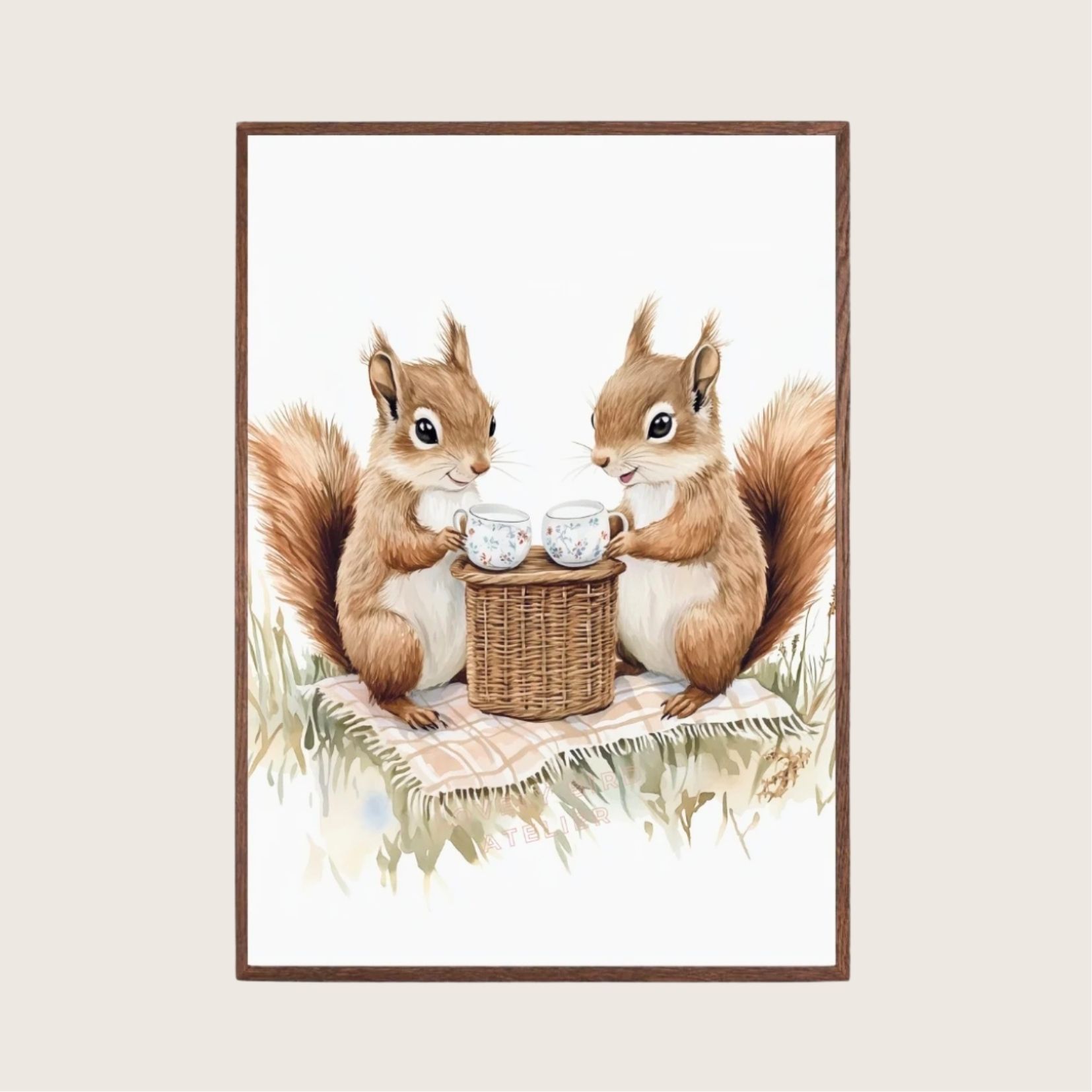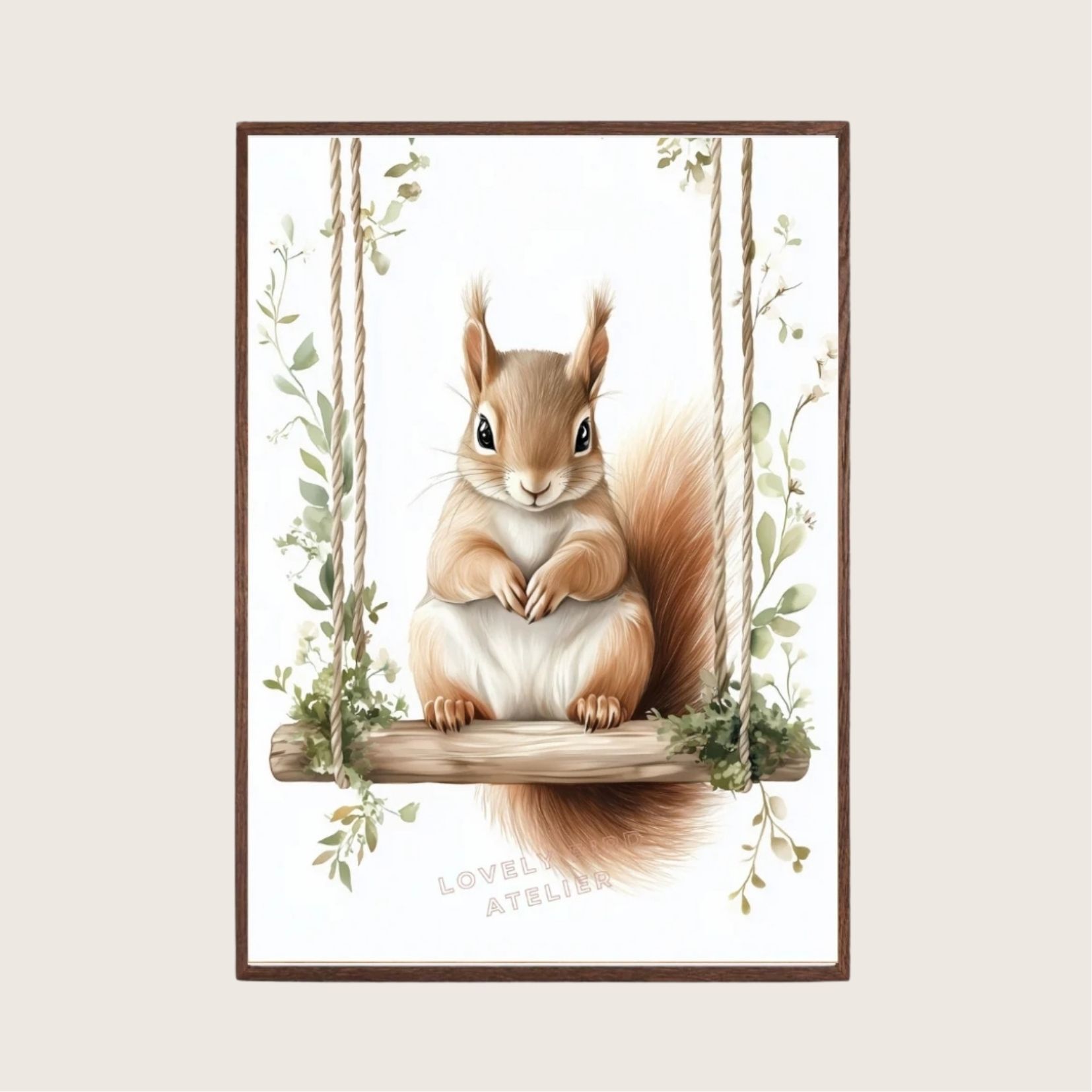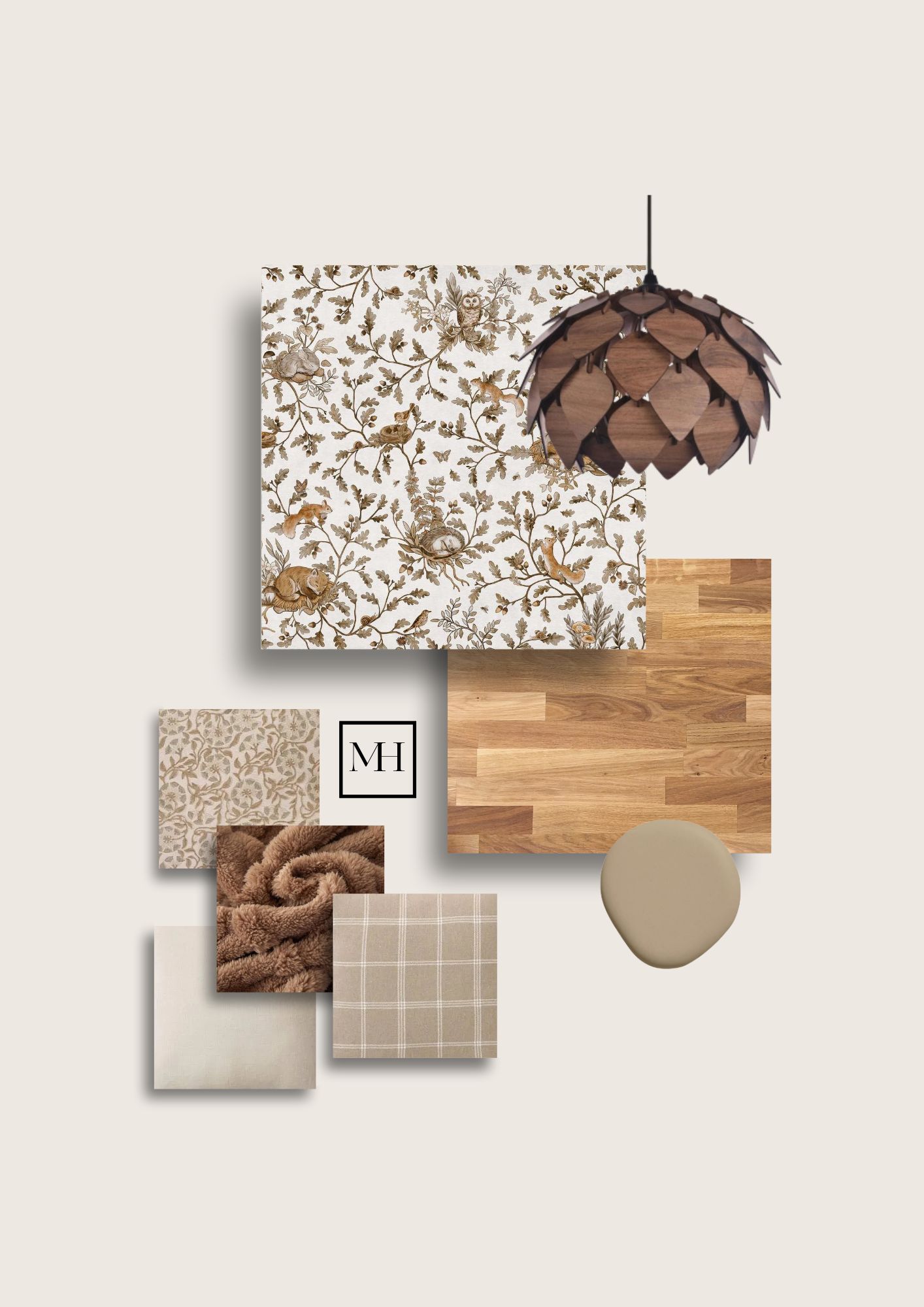 Et puis, il y a ces détails qui font tout… Un petit écureuil posé comme un compagnon discret, des illustrations choisies avec soin et signées Atelier Les Jolies Choses, et cette suspension en forme de pomme de pin, comme un clin d’œil à la forêt qui veille doucement sur la pièce.