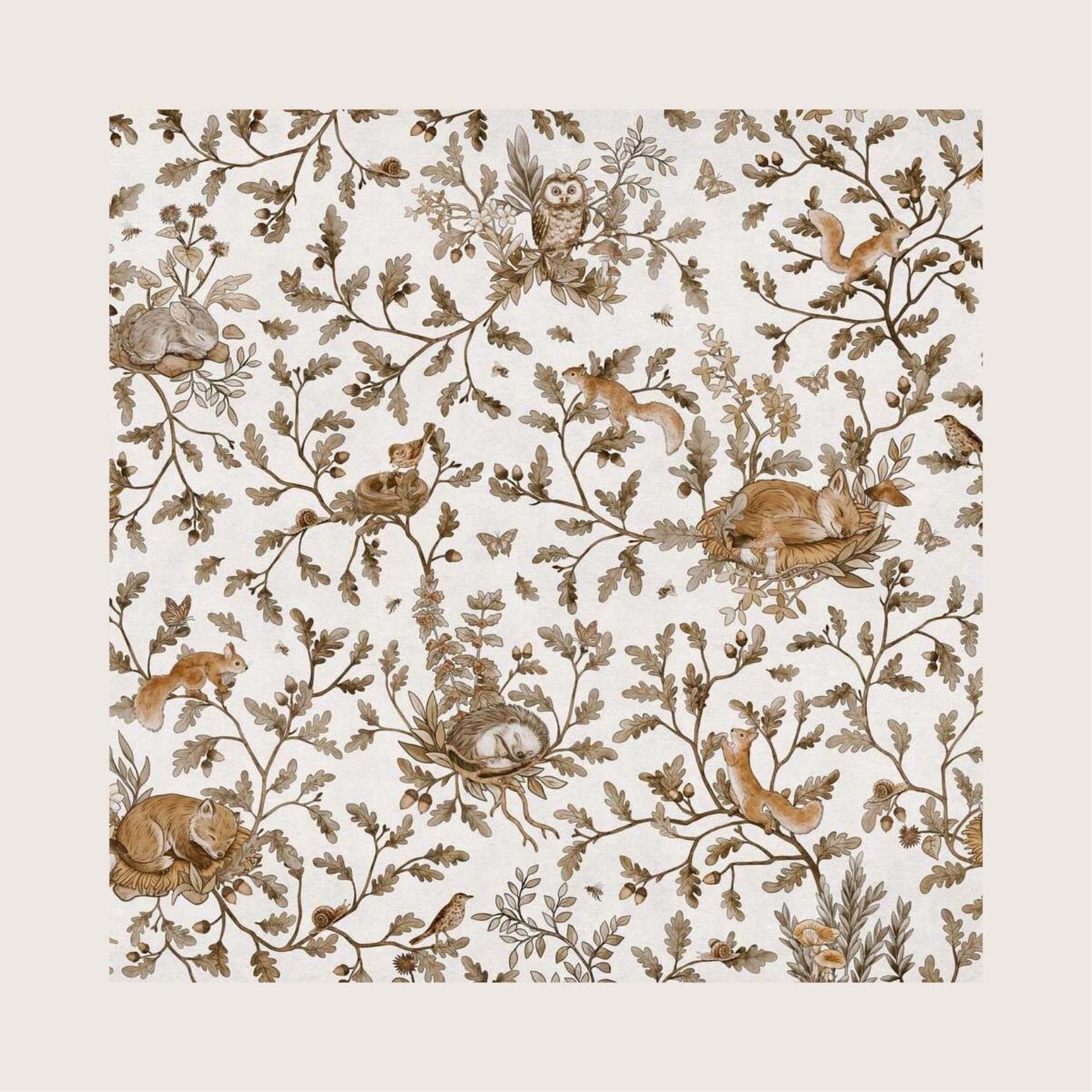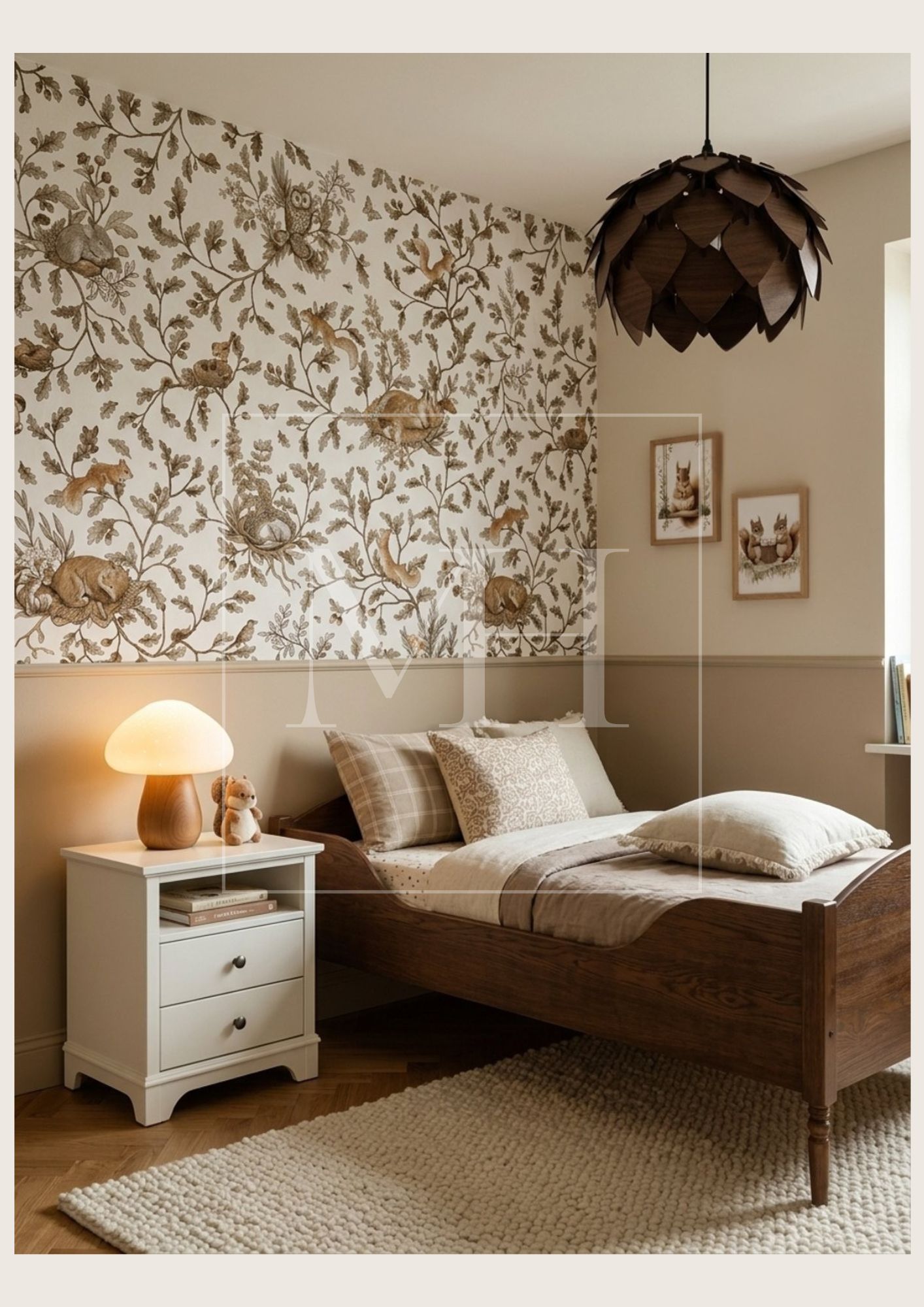 Le papier peint, délicatement orné de feuillages et de petits écureuils, raconte une histoire à lui seul. Celle d’une nature bienveillante, rassurante, presque familière. Le soubassement beige vient envelopper l’espace, apportant une sensation de calme et de sécurité, comme un cocon dans lequel l’enfant peut pleinement se déposer.